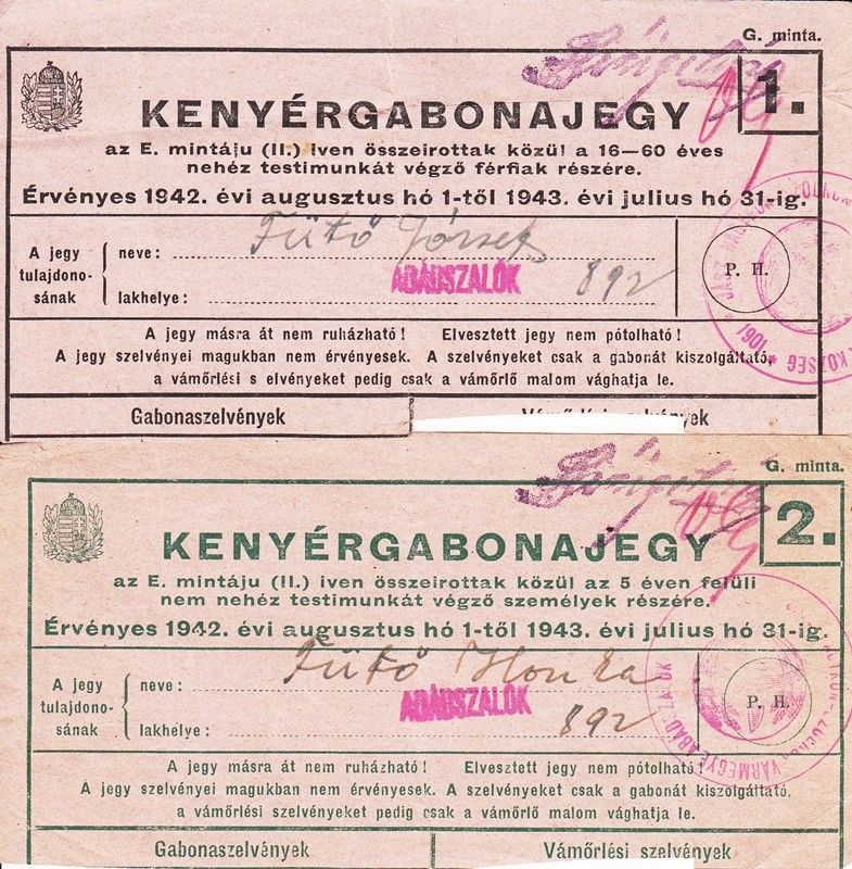 1942 2 db kenyérgabona jegy 5 éven felüli, nem nehéz testi munkát végző részére