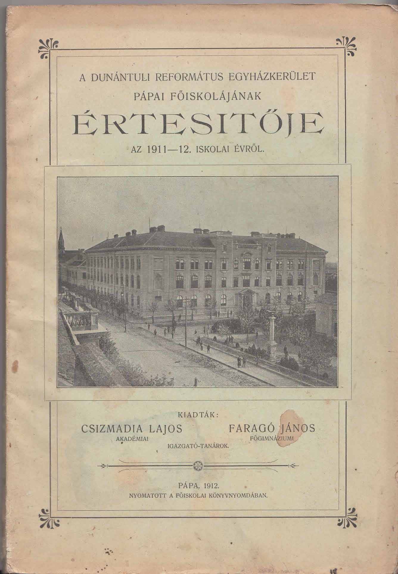 A Dunántuli Református Egyházkerület Pápai Főiskolájának értesítője az 1911-12. iskolai évről