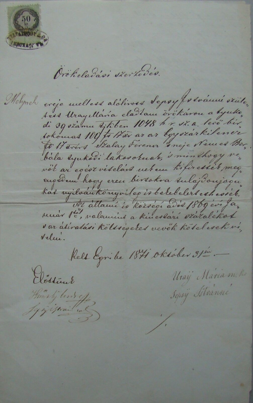 1871 Örök eladási szerződésl 50kr bélyeggel, pecséttel