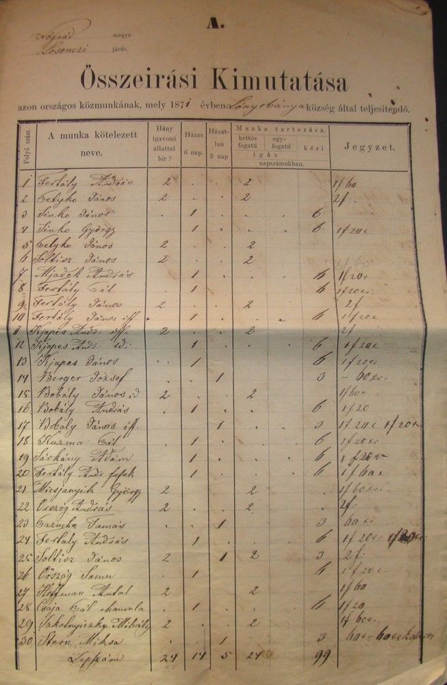 1871 Összeírás kimutatása a Lónyabánya lakosainak (Nográd megye) közmunka teljesítéséről, 6 oldal