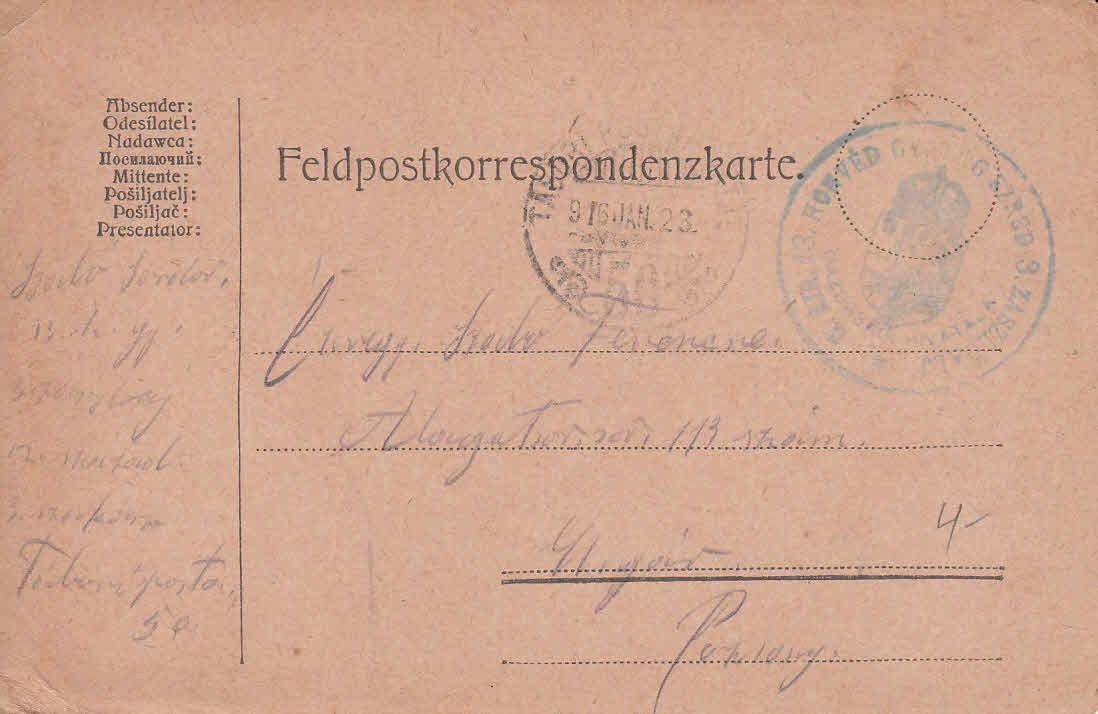 1915 Tábori postai levelezőlap "M.Kir. 13. Honvéd Gyalogezred. 3. zászlóal " körpecséttel