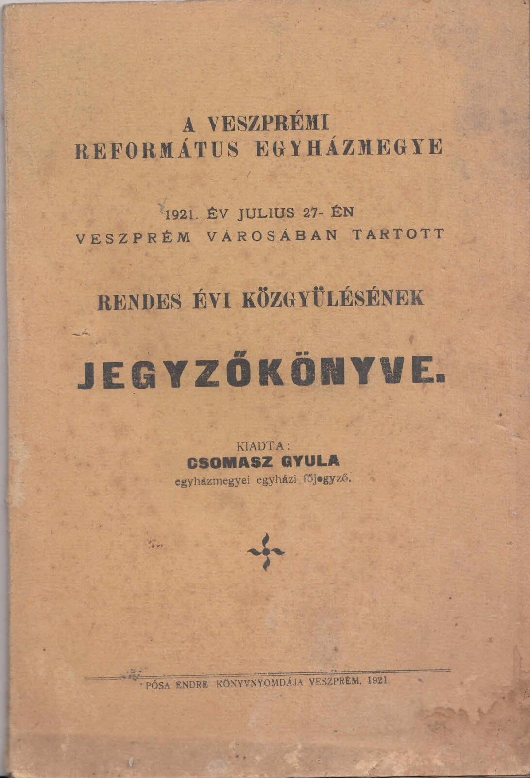 1921. A veszprémi Ev. Reform Egyházmegye, Veszprém városában tartott rendes közgyülésének jegyzőkönyve