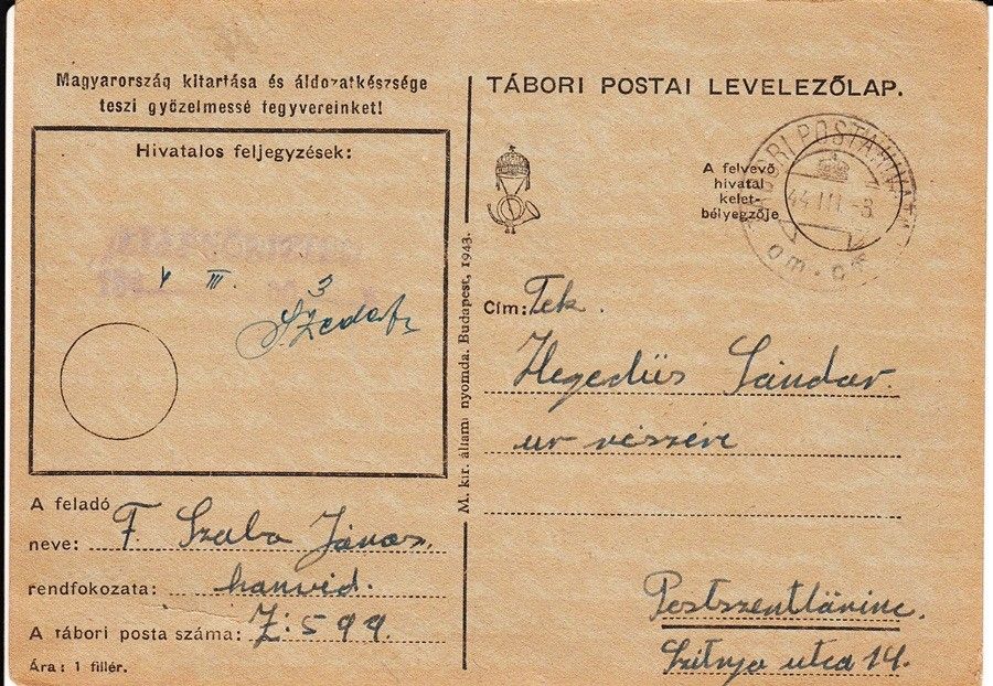 54-866 1944. Tábori Postai Levelezőlap. (ellenörzőtt )