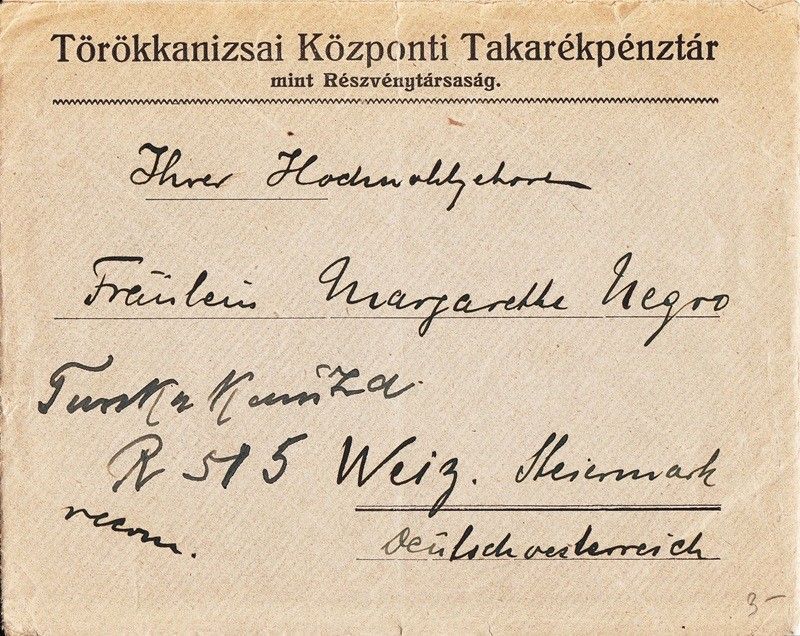 Levélboríték a Törökkanizsai Központi Takarékpénztár Rt. fejlécével