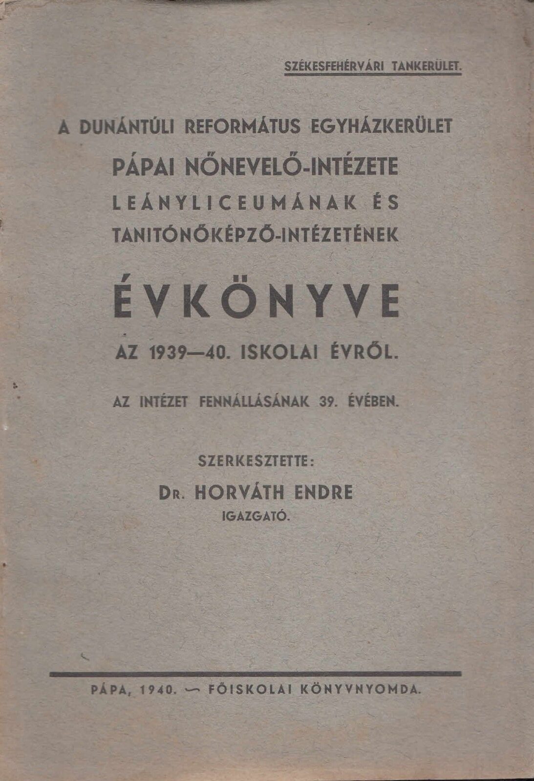 A Dunántuli Református Egyházkerület, Pápa Nevelő-Intézete leányliceumának és Tanitónőképző-intézetének Évkönyve az 1939-40. iskolai évről