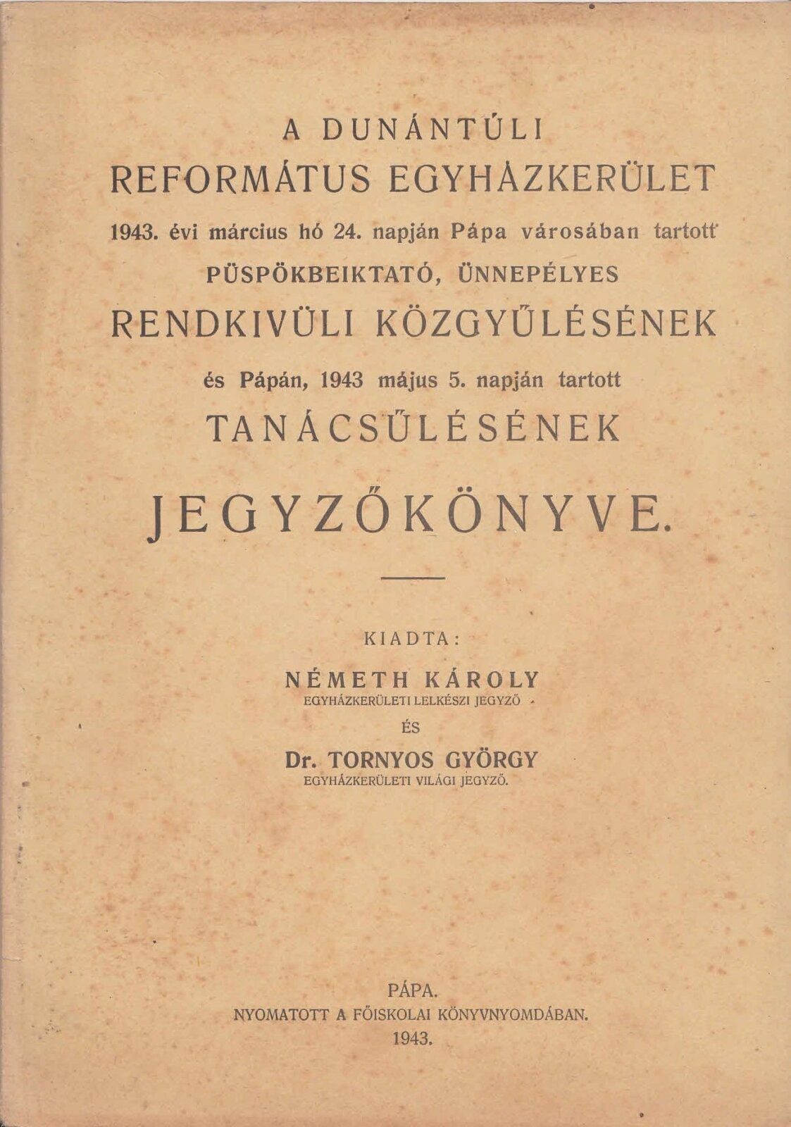 1943 A Dunántuli Református Egyházkerület 1943. évi március hó 24-napján Pápa városában tartott püspökbeiktató, ünnepélyes rendkivüli közgyülésének és tanácsülésének jegyzőkönyve