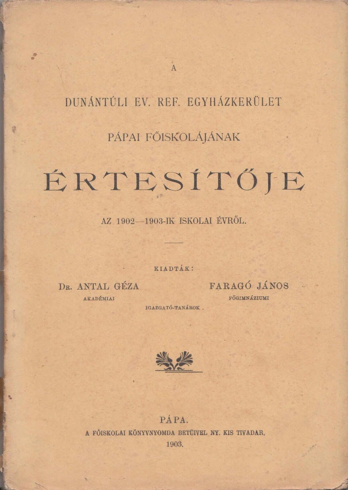 A Dunántuli Református Egyházkerület Pápai Főiskolájának értesítője az 1902-03. iskolai évről