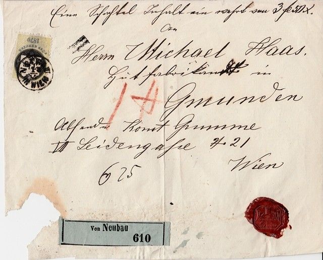 cca 1870 Csomag feladási lap okmánybélyeggel és viaszpecséttel (sarka sérült)