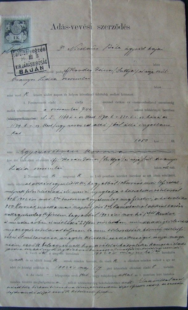 1902 Adás-Vételi szerződés 1K bélyeggel