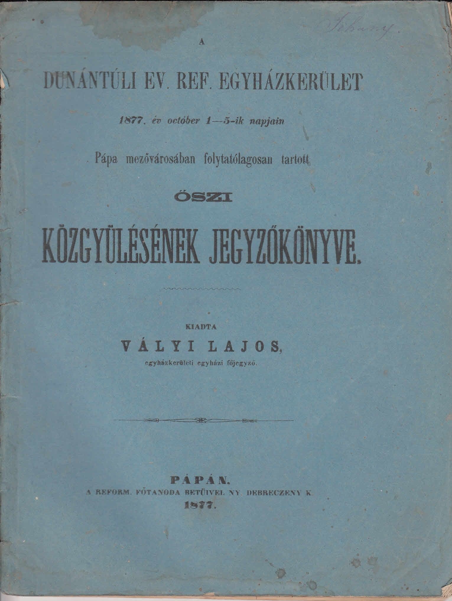1877. A Dunántuli Református Egyházkerület, Pápa mezővárosában folytatólagosan tartott őszi közgyülésének jegyzőkönyve