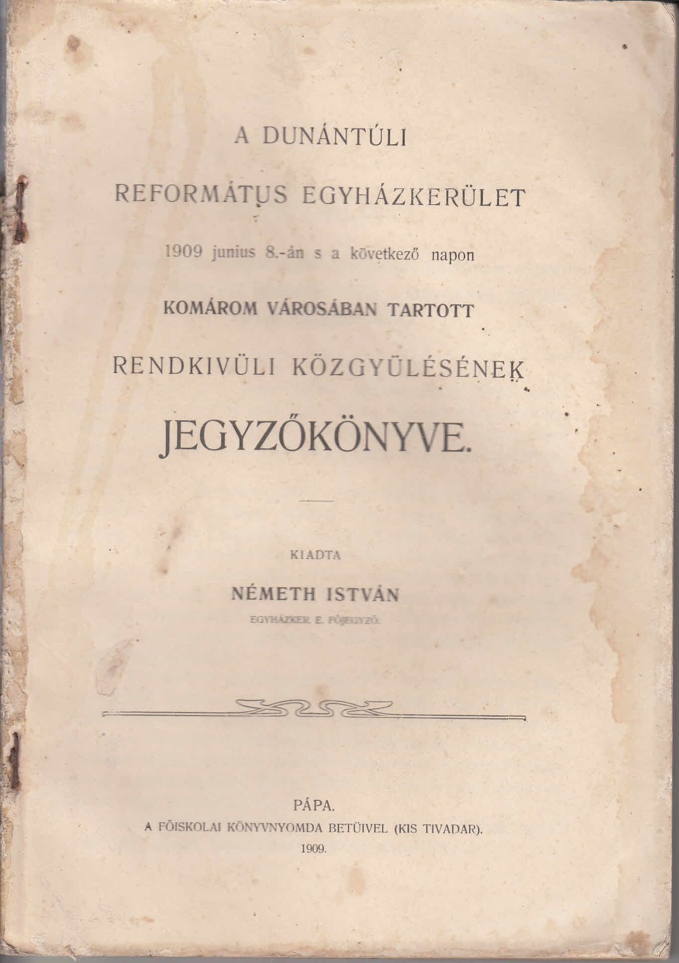 1909. A Dunántuli Református Egyházkerület, Komárom városában tartott rendkivüli közgyülésének jegyzőkönyve