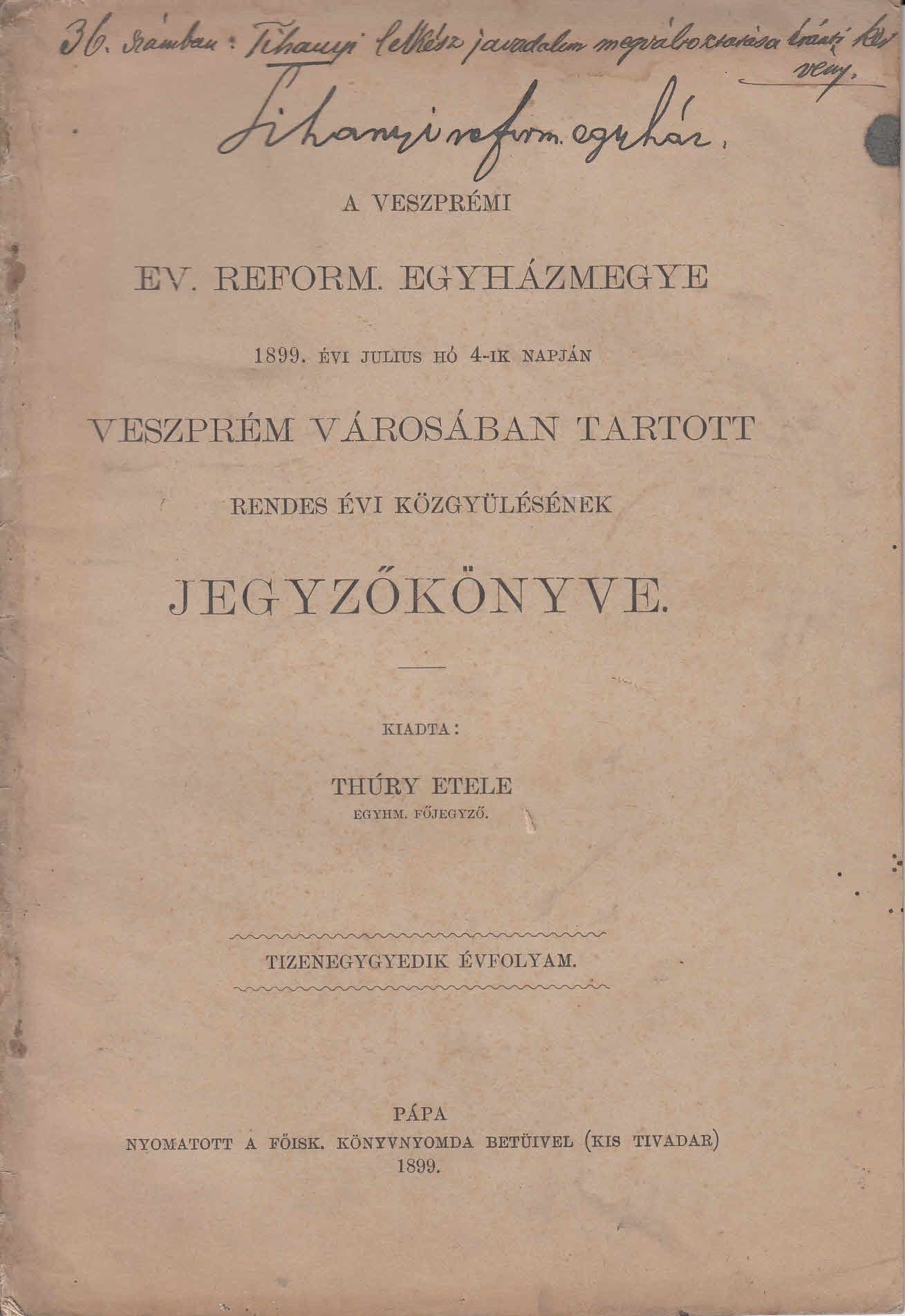 1899. A veszprémi Ev. Reform Egyházmegye, Veszprém városában tartott rendes éves közgyülésének jegyzőkönyve