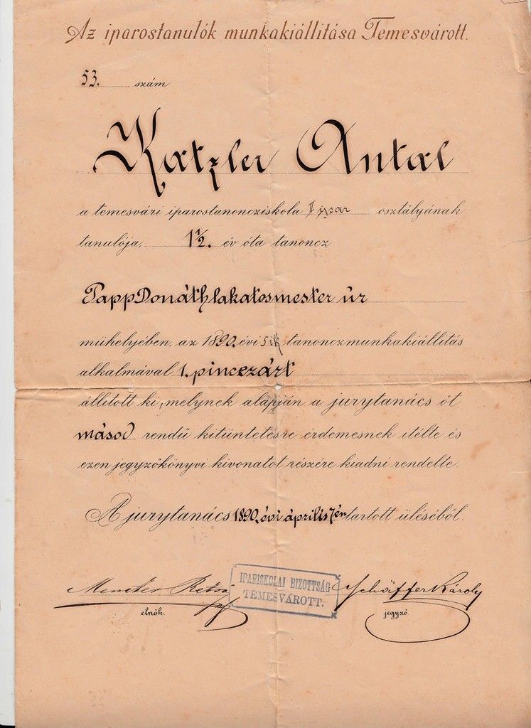 1890 Iparostanulók Munkakiállitás jegyzőkünyvi kivonat / Temesvár