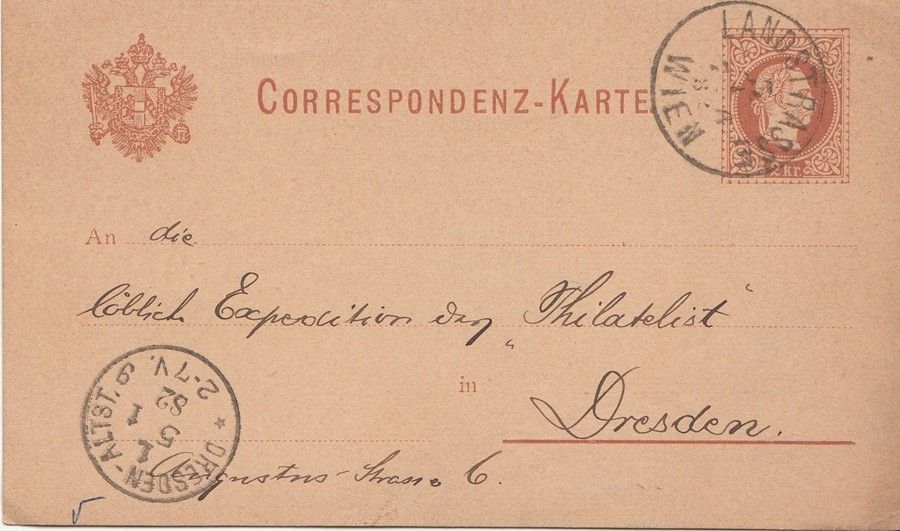 1882 Díjjegyes levelezőlap "WIEN" – Dresdai érkeztető pecséttel