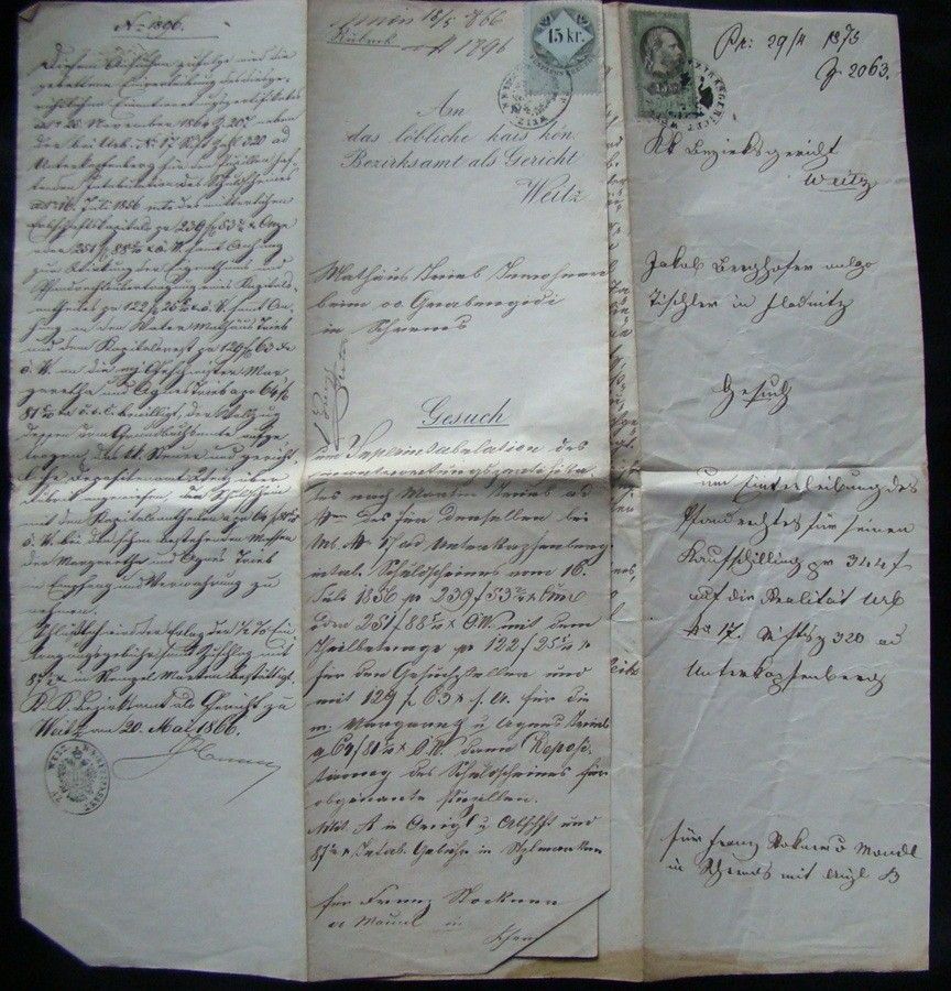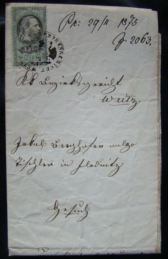 1873. 2 db Kerestlevél 15 koronás okmánybélyeggel