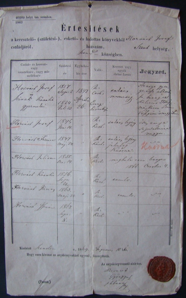 1869 Értesités Horváth József Szend községi lakos családjáról, viaszpecséttel
