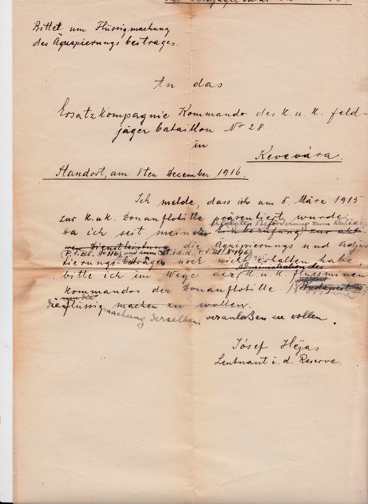 1916 Ellátmány kérése a 28. Határvadász század részére Kevevára (Szerbia)