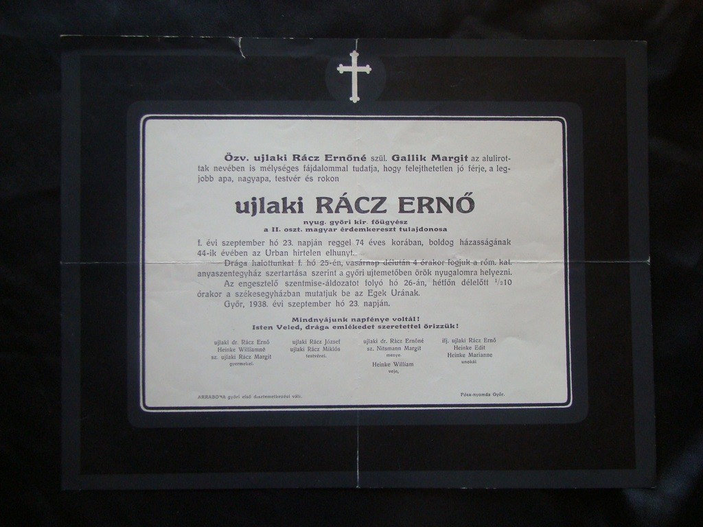 1938 Gyászjelentés ujlaki Rácz Ernő (1864-1938) győri kir. főügyész haláláról