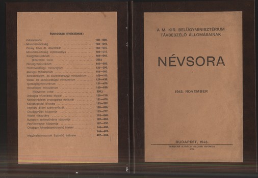 A magyar királyi belügyminisztérium távbeszélő állomásainak névsora. 1943. november. A magyar királyi belügyminisztérium távbeszélő állomásainak névsora. 1943. november.