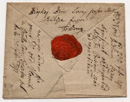 A tatai és gesztesi Eszterházy-uradalomból Csákvárra küldött boríték 1792-ből, magyar és latin felirattal, az Eszterházyak vörös viaszpecsétjével. A tatai és gesztesi Eszterházy-uradalomból Csákvárra küldött boríték 1792-ből, magyar és latin felirattal, a