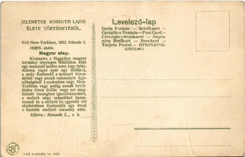 Amerikai Kossuth dollár. Jelenetek Kossuth Lajos élete történetéből Első kiadás VI. kép, dombornyomott / Hungarian Fund Kossuth dollar, Embossed Athenaeum rt. litho s: K. Sávely D.