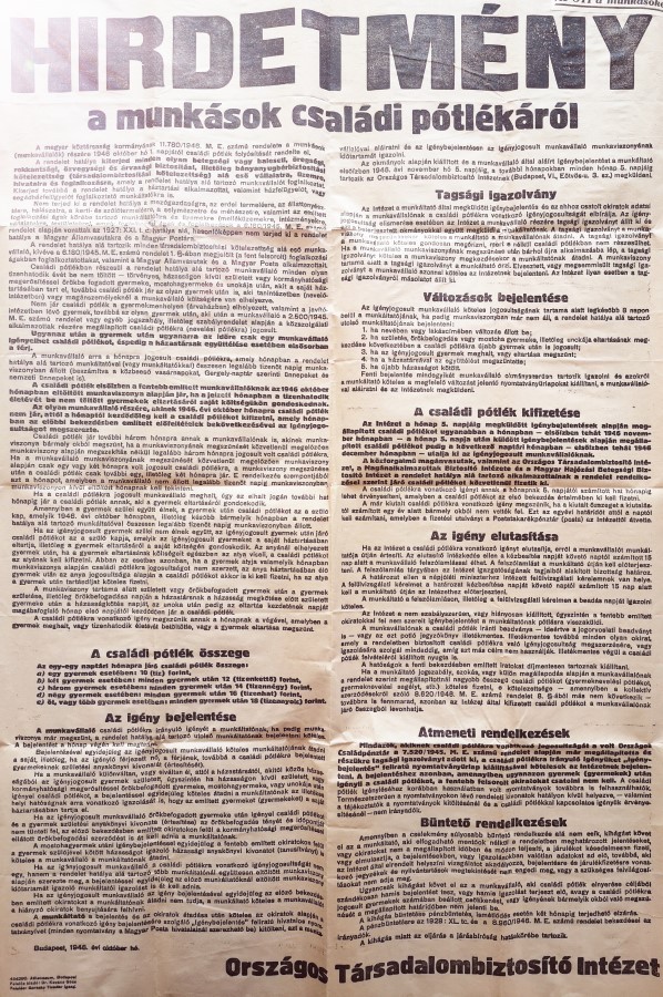 Az Országos Társadalombiztosító Intézet Az Országos Társadalombiztosító Intézet hirdetménye a munkások családi pótlékáról 1946-ból.