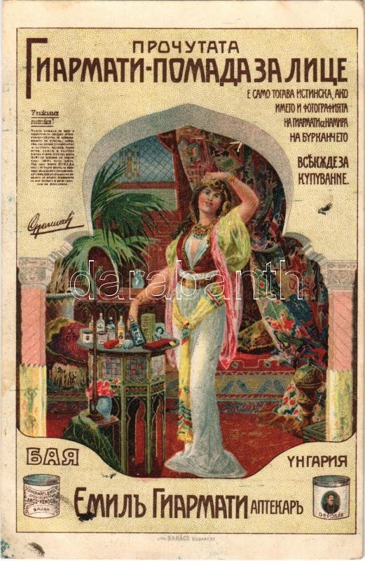 Baja, Gyarmati Emil féle arckenőcs bolgár nyelvű litho reklámlapja, kapható Gyarmati gyógyszertárában Baján / Hungarian pharmacist’s face cream advertising card, Bulgarian edition. litho (fl)<a href="https://www.darabanth.com/hu/nagyaukcio/40/katego