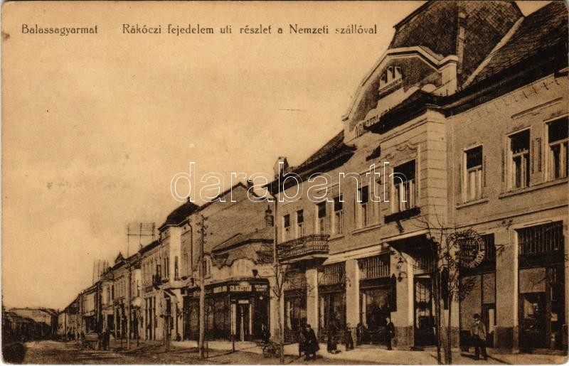 Balassagyarmat, Rákóczi fejedelem úti részlet, Nemzeti szálló, Silberstein üzlete. Halyák István kiadása (fl)<a href="https://www.darabanth.com/hu/gyorsarveres/411/kategoriak~Kepeslapok/Magyarorszag~1000005/Balassagyarmat-Rakoczi-fejedelem-uti-reszl