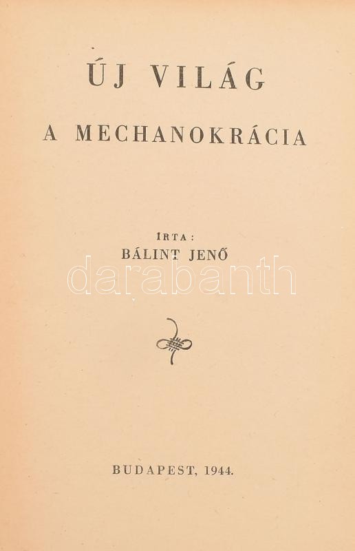 Bálint Jenő: Új világ a mechanokrácia. Bp., 1944., May-ny. Kiadói félvászon-kötés.<a href="https://www.darabanth.com/hu/gyorsarveres/423/kategoriak~Konyvek/Konyvek-Tarsadalomtudomany~2000015/Balint-Jeno-Uj-vilag-a-mechanokracia-Bp-1944-May-ny-Kiadoi