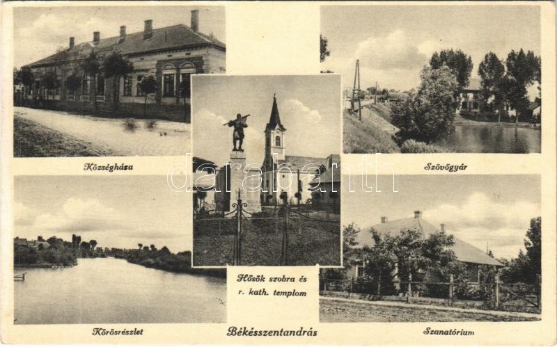 Békésszentandrás, községháza, szövőgyár, Körös részlet, szanatórium, Hősök szobra, római katolikus templom