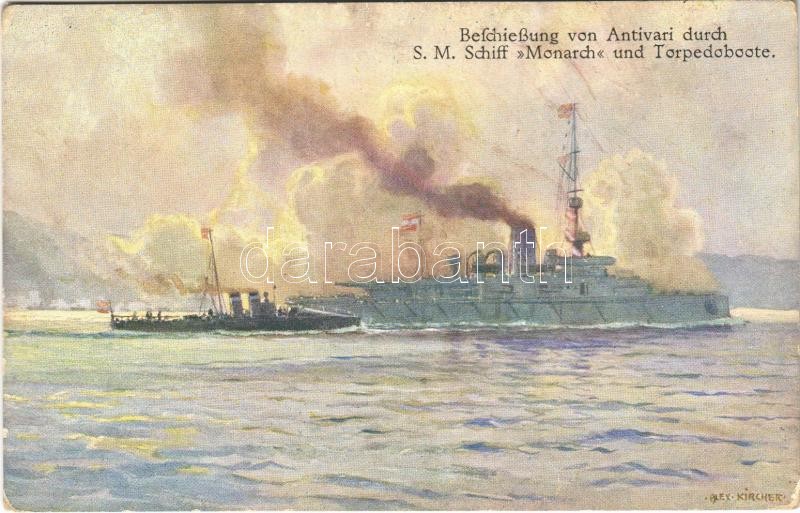 Beschießung von Antivari durch SM Schiff Monarch und Torpedoboote / SMS Monarch az Osztrák-Magyar Haditengerészet Monarch-osztályú partvédő csatahajója és egy torpedóromboló lövi Bar-t (Antivari) / WWI Austro-Hungarian Navy K.u.K.