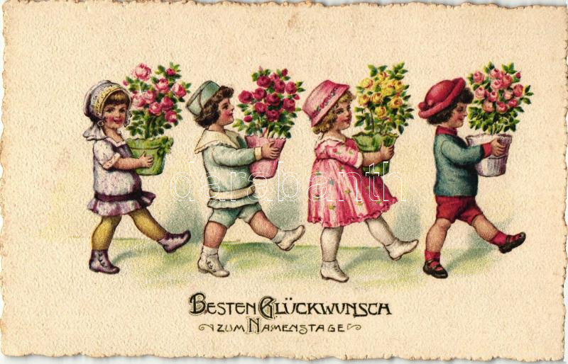 ‘Besten Glückwunsch zum Namenstage’ / Nameday, children with flowerpots, litho<a href="https://www.darabanth.com/hu/gyorsarveres/417/kategoriak~Kepeslapok/Udvozlolapok-Unnepek~1500070/Besten-Gluckwunsch-zum-Namenstage-Nameday-children-with-flowerpot