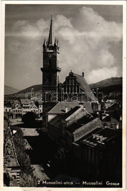 Beszterce, Bistritz, Bistrita; Mussolini utca, Evangélikus templom / street view, Lutheran church (fl)<a href="https://www.darabanth.com/hu/gyorsarveres/410/kategoriak~Kepeslapok/Erdely~1500006/Beszterce-Bistritz-Bistrita-Mussolini-utca-Evangelikus-