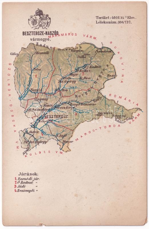 Beszterce-Naszód vármegye térképe. Kiadja Károlyi Gy. / Map of Bistrita-Nasaud county (apró szakadás / tiny tear)<a href="https://www.darabanth.com/hu/gyorsarveres/411/kategoriak~Kepeslapok/Terkep~1000157/Beszterce-Naszod-varmegye-terkepe-Kiadja-Kar