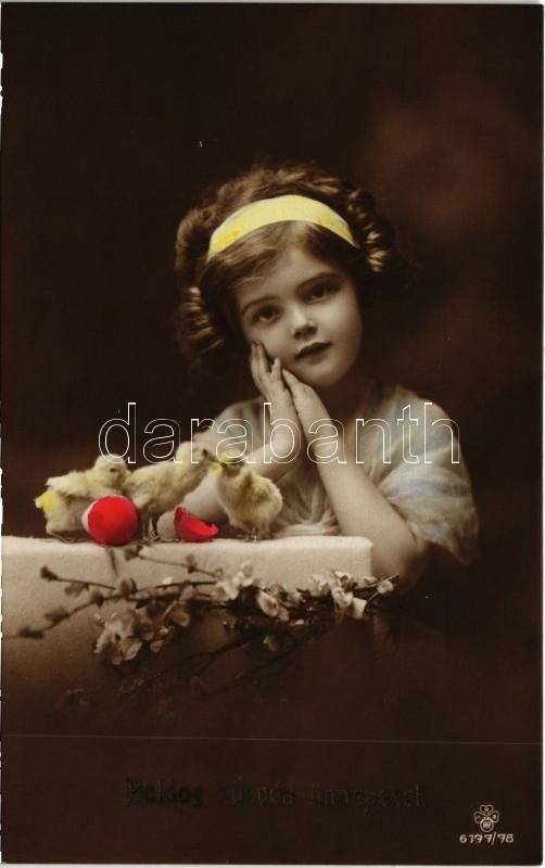 Boldog húsvéti ünnepeket! / Easter greeting card with girl, chicken and eggs<a href="https://www.darabanth.com/hu/gyorsarveres/423/kategoriak~Kepeslapok/Udvozlolapok-Unnepek~1500093/Boldog-husveti-unnepeket-Easter-greeting-card-with-girl-chicken-and