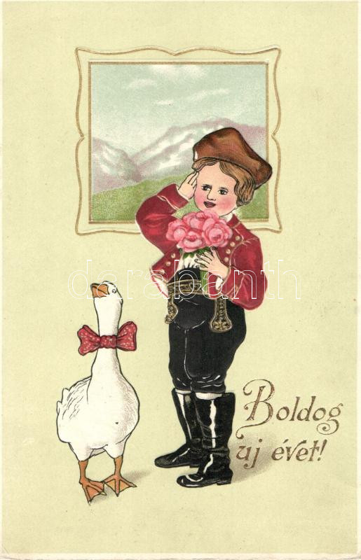 ‘Boldog új évet!’ / New Year, Child in traditional dress, folklore, goose with bowtie, Erika No. 2575, litho, Emb. (EK)<a href="https://www.darabanth.com/hu/gyorsarveres/417/kategoriak~Kepeslapok/Udvozlolapok-Unnepek~1500070/Boldog-uj-evet-New-Year-