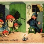 Boldog Újévet! / New Year greeting card, mushroom + ‘1939 Téli sport a Kassai havasokban Sporthét Kassa’ So. Stpl.<a href="https://www.darabanth.com/hu/gyorsarveres/417/kategoriak~Kepeslapok/Gomba~1500024/Boldog-Ujevet-New-Year-greeting-card-mushroo