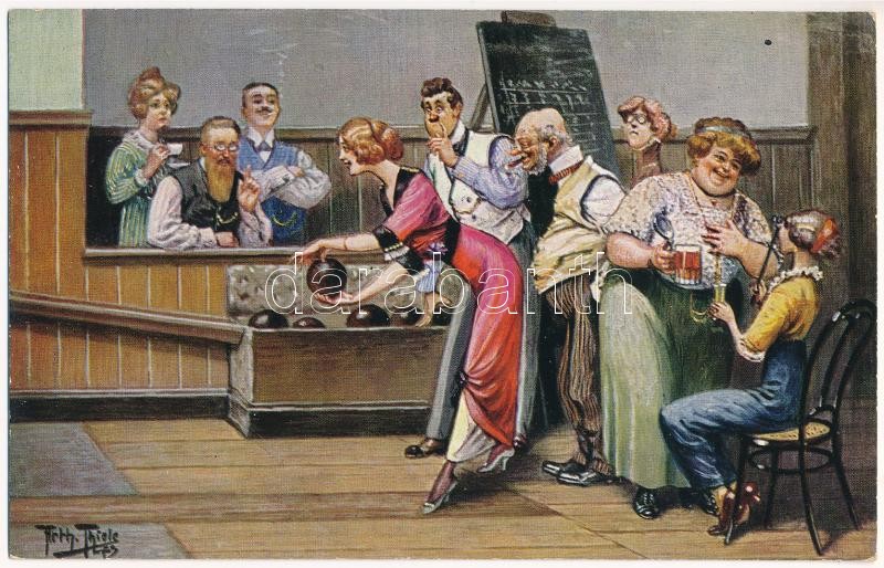 Bowling alley with men and women smoking and drinking. T.S.N. Serie 1682. (6 Dess.) s: Arthur Thiele