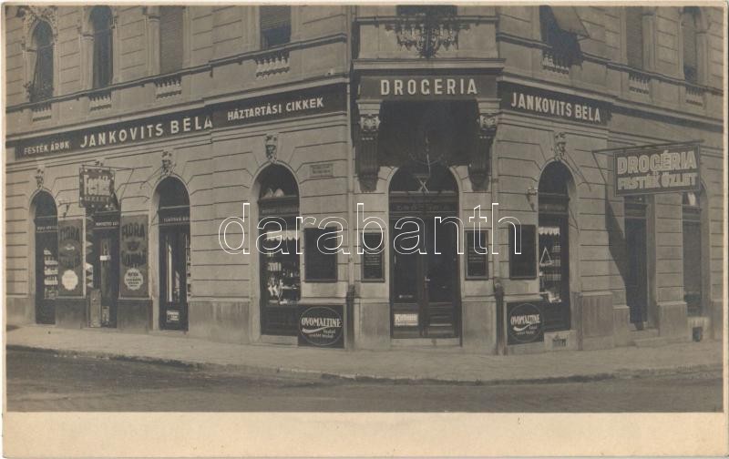 Budapest I. Németvölgy, Márvány és Alkotás utca sarok, Jankovits Béla ‘Szent Imre’ Drogériája és festék üzlete, Flora szappan, Ovomaltine és Kielhauser reklámok. photo<a href="https://www.darabanth.com/hu/gyorsarveres/414/kategoriak~Kepeslapok/Magya