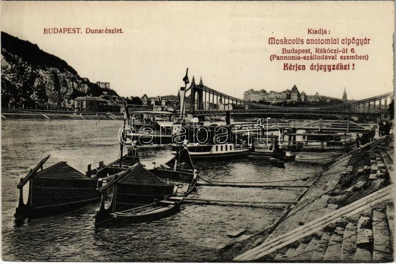 Budapest V. Duna részlet, pesti rakpart, gőzhajók. Moskovits Anatómiai Cipőgyár reklámja