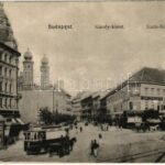 Budapest V. Károly körút, Dohány utcai zsinagóga, villamosok, Dreher Antal sörfőzdéjének városi főraktára, Schlinger Ferenc első budapesti szűcs és szőrme áru raktára, sörcsarnok, Szikla D. fogorvos, Frank és Steiner, Kohn Mór és fiai és Spieler M. üzlete