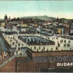 Budapest VI. Párisi Nagyáruház nagy tetősétánya, vendéglő, jégpálya korcsolyázókkal