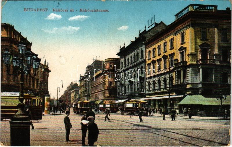 Budapest VII. Rákóczi út, villamosok, Emke kávéház, szálloda (Rb)