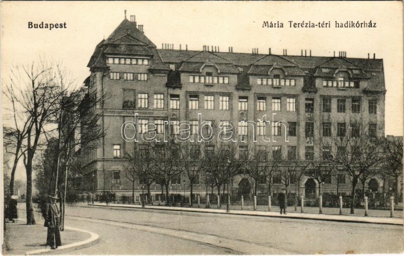 Budapest VIII. Mária Terézia téri hadikórház a Horváth Mihály téren, villamos. Kallos Oszkár felvétele<a href="https://www.darabanth.com/hu/gyorsarveres/422/kategoriak~Kepeslapok/Magyarorszag~1500004/Budapest-VIII-Maria-Terezia-teri-hadikorhaz-a-Hor