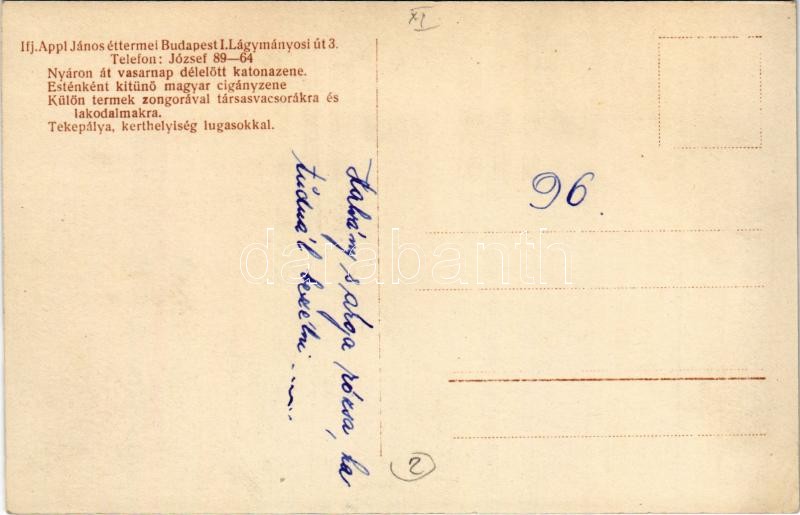 Budapest XI. Ifj. Appl János éttermei ‘Nyáron át vasárnap délelőtt katonazene. Esténként kitűnő cigányzene. Külön termek zongorával társasvacsorákra és lakodalmakra. Tekepálya, kerthelyiség lugasokkal’ Lágymányosi út 3. Csiky