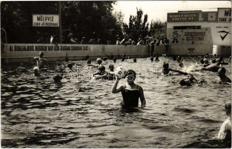 Budapest XIII. Margitsziget, Palatinus strand, fürdőzők, ‘Mélyvíz csak jó úszóknak’ ‘Az oldalfalakról beugrálni vagy azon átugrani szigorúan tilos!’ feliratok. photo (non PC) (EK)<a href="https://www.darabanth.com/hu/gyorsarveres/411/kategoriak~Kepe
