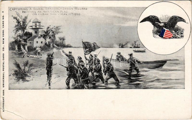 Capturing a signal station. Ensign Willard hoisting an American flag on Cuban Soil – May 11th 1898. United States Navy (EB)<a href="https://www.darabanth.com/hu/gyorsarveres/439/kategoriak~Kepeslapok/Hadihajo~2000034/Capturing-a-signal-station-Ensig