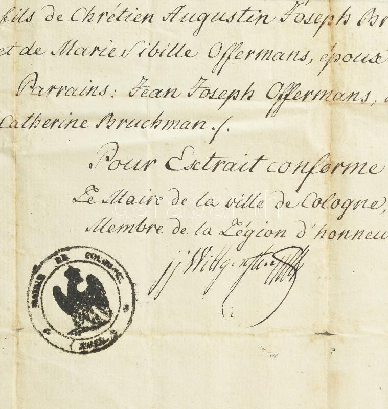 cca 1800 Köln, születési anyakönyvi kivonat másolat francia nyelven, rajta Johann Jakob von Wittgenstein (1754-1823) kölni polgármester autográf aláírásával / Autograph signature of Johann Jakob von Wittgenstein (1754-1823) mayor of
