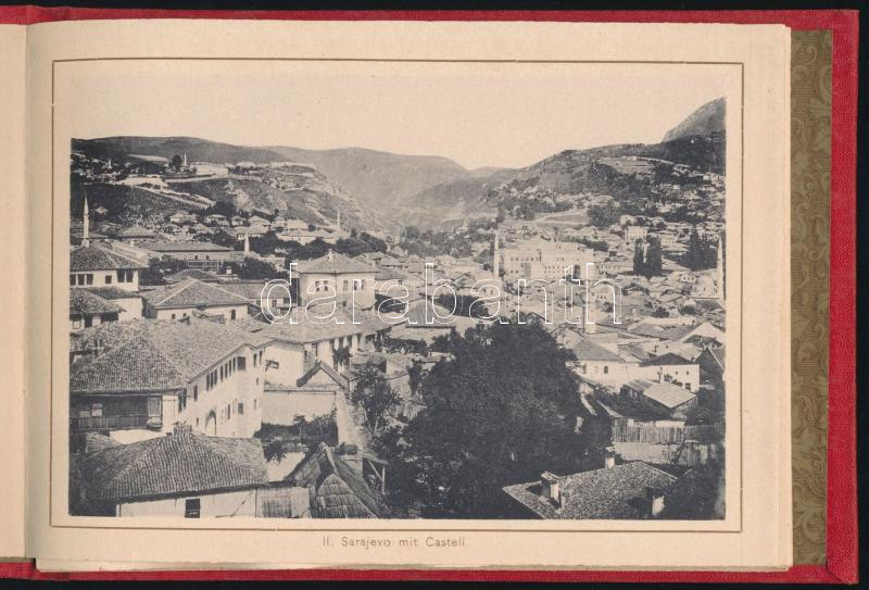 cca 1900 Album von Sarajevo. 10 fekete-fehér fotót tartalmazó leporello. Sarajevo, én., Daniel A. Kajon, 10 (nyomatok) t. Kiadói aranyozott haránt-alakú egészvászon-kötés, a borítón Bosznia-Hercegovina címerével, kissé kopott borítóval. / cca 1900 Album von Sarajevo. Sarajevo, én., Daniel A. Kajon, 10 (black-and-white pictures, prints) t. With the coat of arms of Bosnia-Herzegovina on the first cover. Gilt linen-binding, with little bit worn