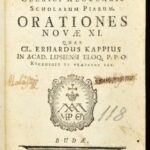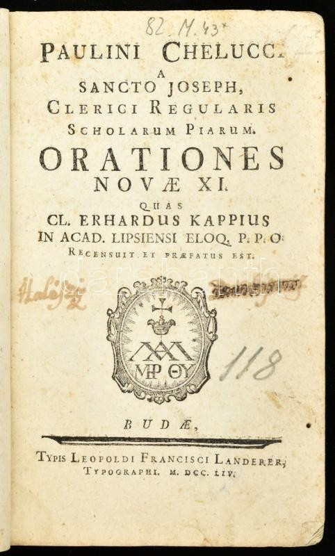 Chelluci, Paulin(o): Orationes Novae XI. – Quas Cl. Erhardus Kappius in Acad. Lipsiensi Eloq. P. P. O. recensuit et praefatus est. – – a Sancto Joseph clerici regularis scholarum piarum. Budae, 1754. Leopoldi Francisci Landerer. Korabelli papírkötésben 18